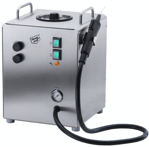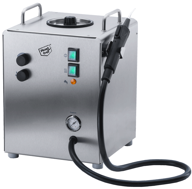 - Reservatório com capacidade de 5 litros, conectado a uma pistola de acionamento manual com quatro funções: jato de água quente, vapor seco, vapor saturado e ar comprimido, a uma pressão de 0 a 6 Bars, temperatura do vapor de 95 a 50 °C conforme a distância;